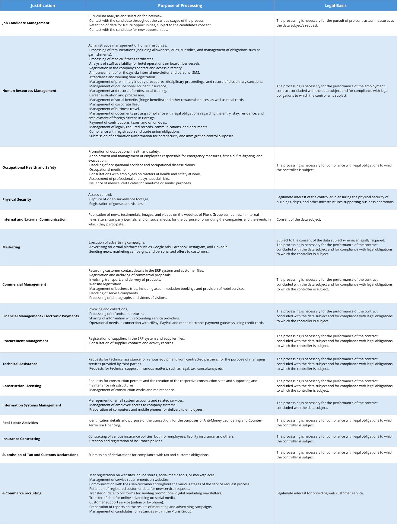 In general terms, the Pluris Group uses personal data in the situations and for the justifications, purposes, and legal bases presented below: