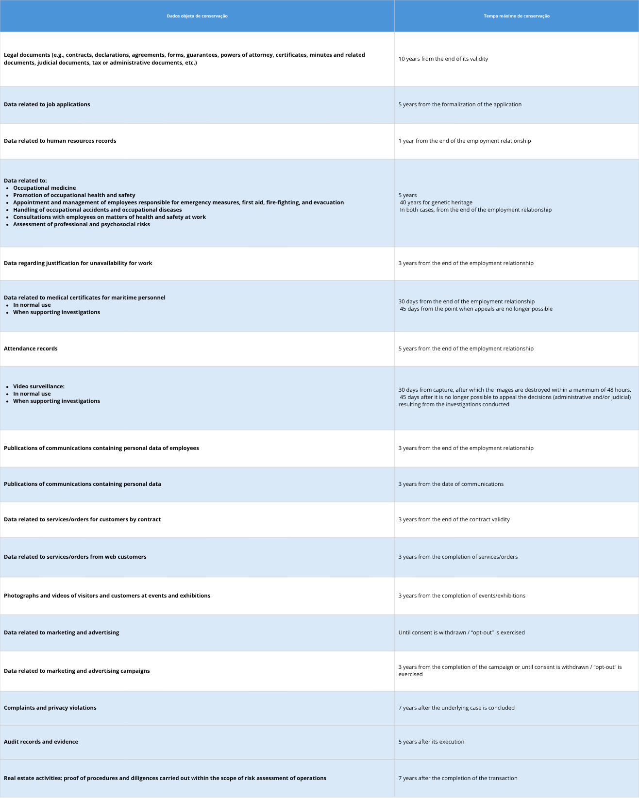 In any case, and prevailing over what is indicated in the table above, if it is necessary to retain personal data for the purpose of handling a complaint, an inspection process of an administrative offence nature, an administrative or judicial procedure, a work accident/occupational disease compensation process, among others, such data shall be retained for a period of 7 years after the date on which that inspection, complaint, administrative offence, administrative or judicial process has been definitively concluded, without the possibility of appeal or further challenge; or, in the case of data relating to the compensation of a work accident/occupational disease, for a period of 5 years after the worker’s incapacity has become permanently stabilized, without any possibility of future alteration.